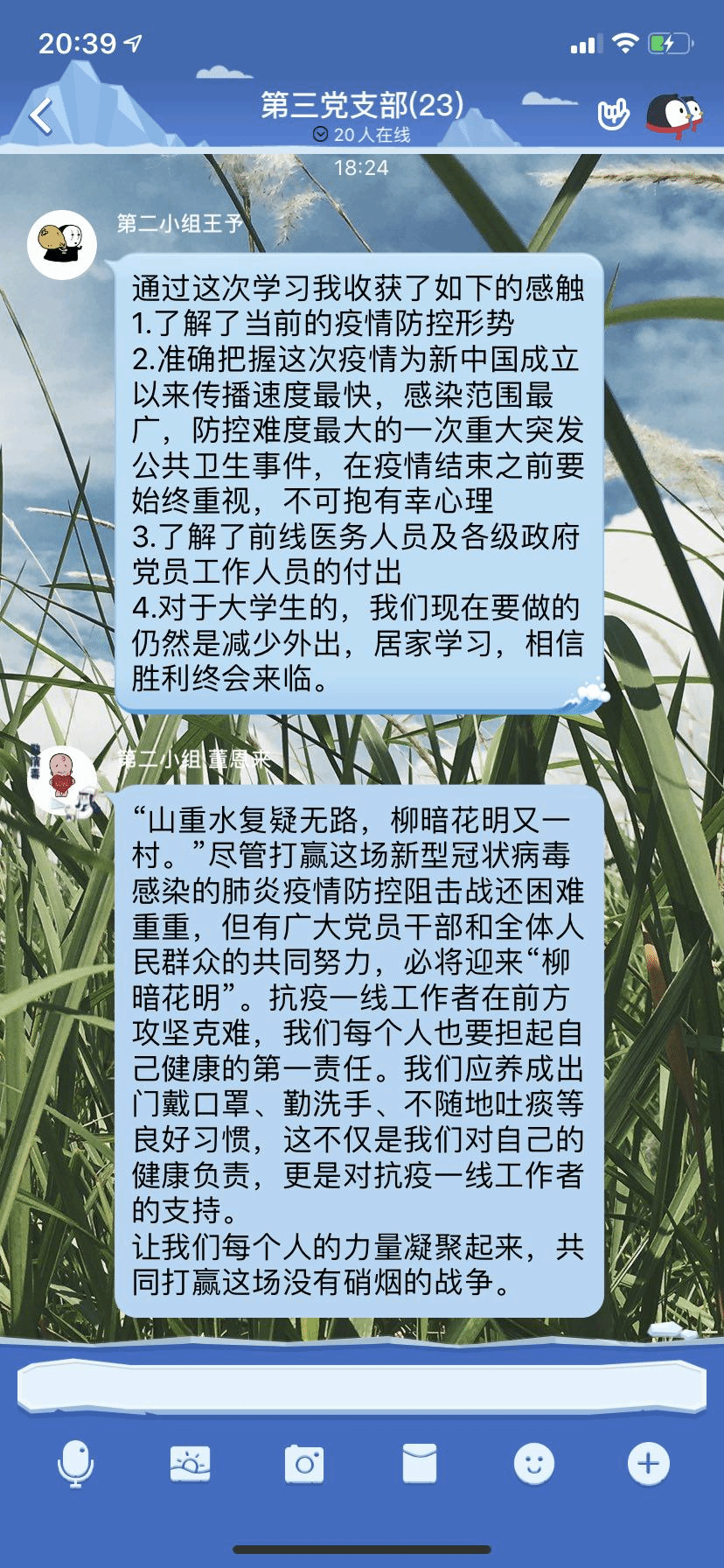 党支部书记任融同志做最后总结,她强调:今年是一个特殊的年份,在全国抗击疫情的关键时刻,我们作为一名党员要做到认清形势,明确责任,以身作则。关注官方信息,不传谣,不信谣。尽自己的能力叮嘱身边的人重视起来,不聚会,没有不必要的事情不要出门。要遵守学校安排,绝不提前返校。相信很快这场战役就会胜利,经此一役,我们伟大的祖国会更加富强。